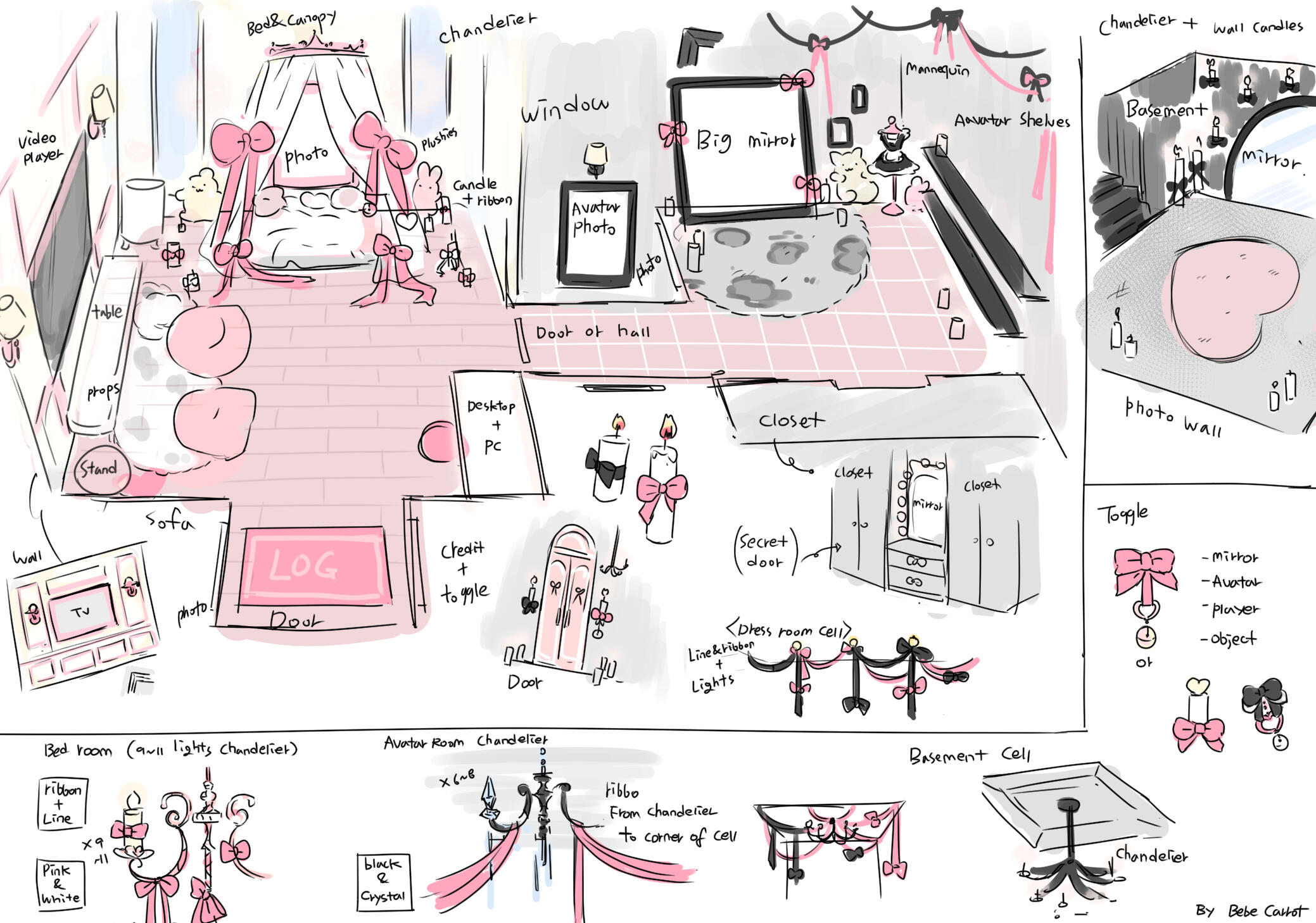 Avatar shelves , wall props , chandelier with ribbons ,<Basement room>